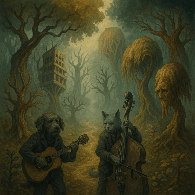 「不,你看。」敗犬指著眼前逐漸延伸的道路。無數怪異的樹木構成了綿延不絕的樹海,彼此錯雜卻又在一種更高階的秩序裡協調,像是某種宏觀的算法,替迷途者指引方向。
