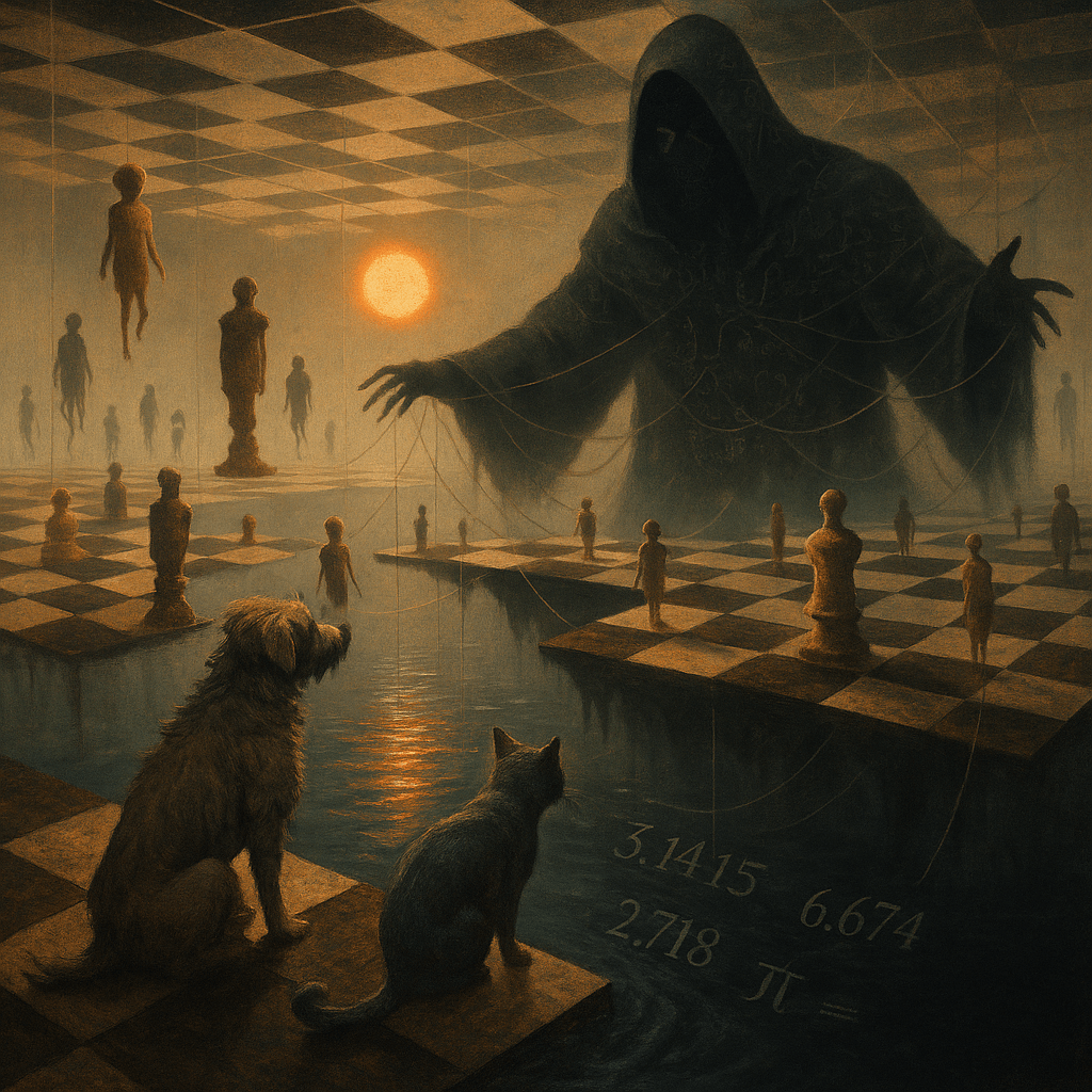 棋盤的每一格,都是一片漂浮的陸地,懸掛在深淵之上;格與格之間,用細得幾乎看不見的銀線連著——那是因果的鎖鏈。
