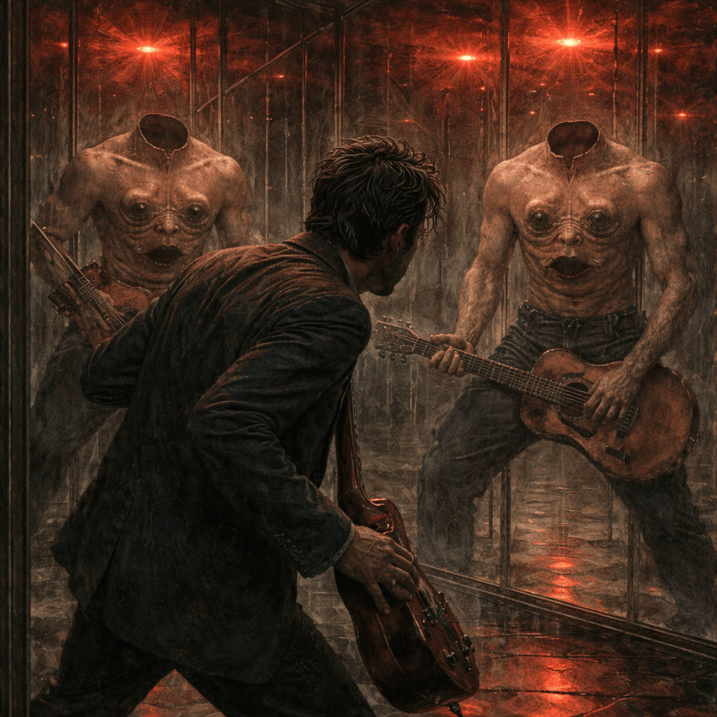 敗犬站了起來,抹去臉上的汗水跟淚水,重新抱起了吉他。他舒展了僵硬的肩膀,不再盯著鏡中的刑天,只是看著掌中琴弦。